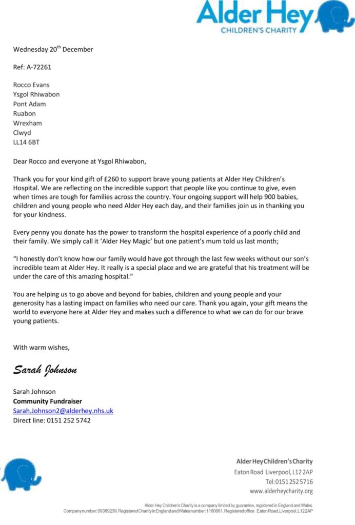UPDATE, 20-12-23, Rocco and the School have received a letter from Alder Hey: