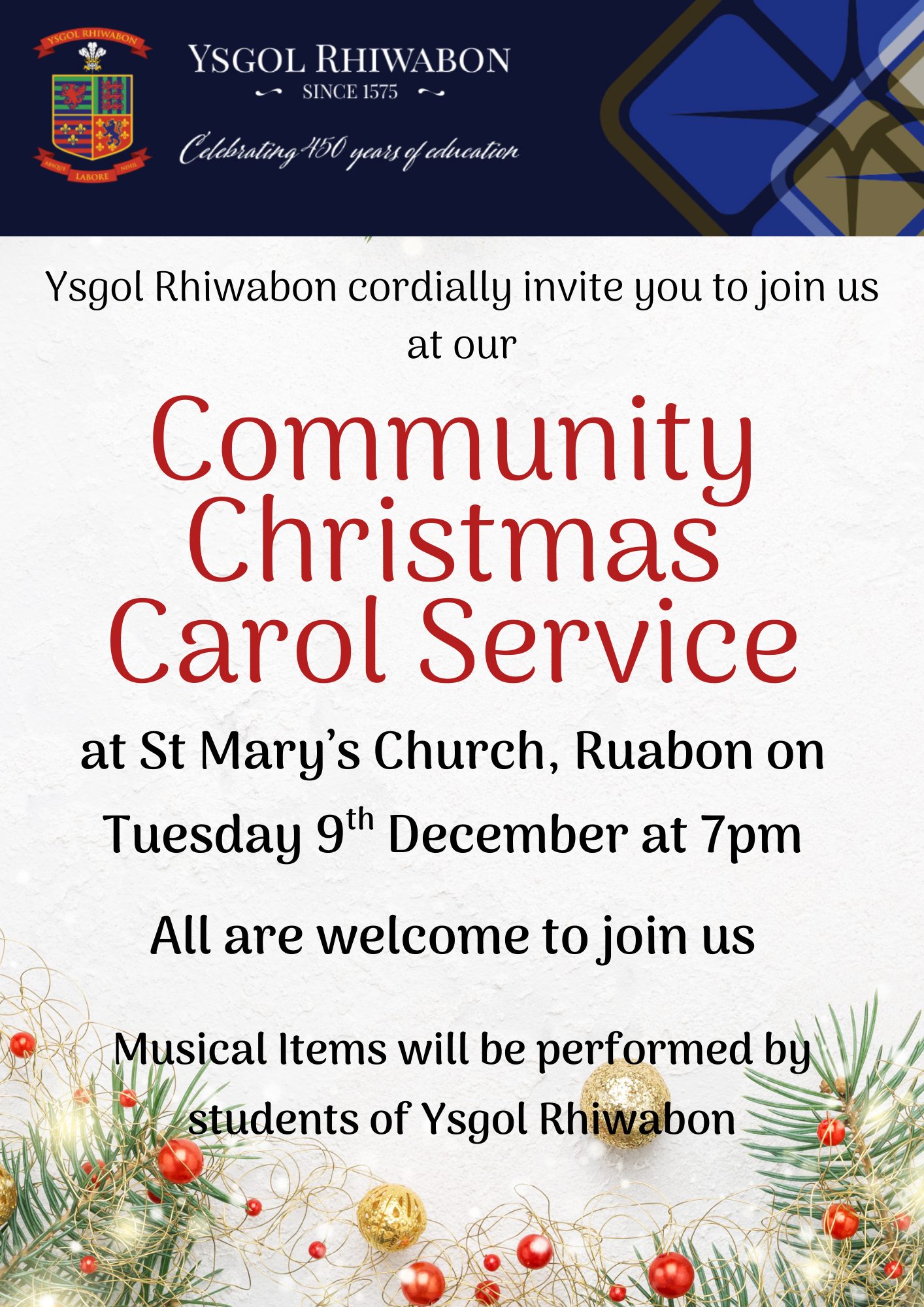 On Tuesday December 9th, Ysgol Rhiwabon hold their annual Community Christmas Carol Service at St. Mary’s Church in Ruabon, starting at 7pm.