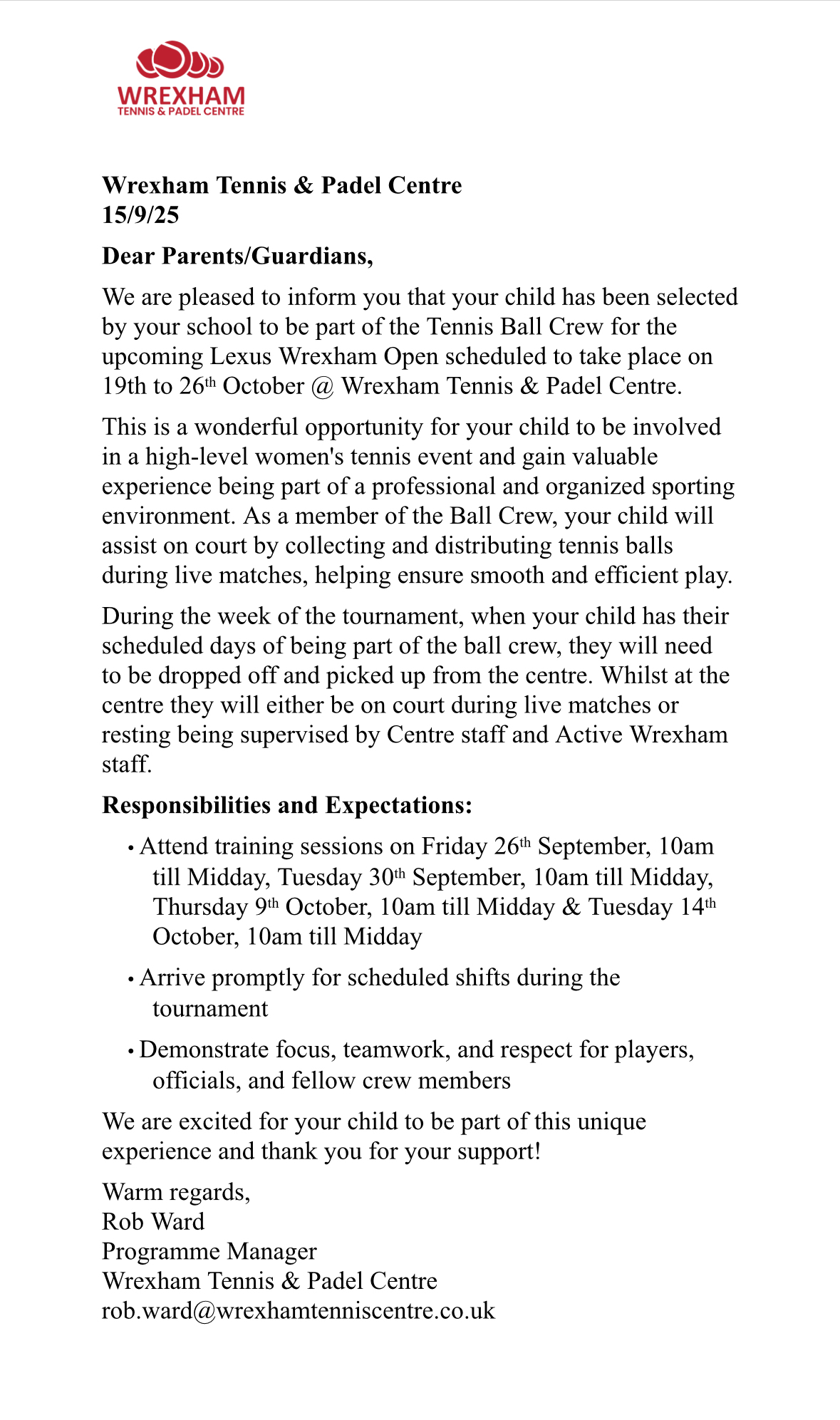 A selection of our Sports Leaders have been selected to be part of the ball crew for the up coming Lexus Wrexham  Open, which is being held in Wrexham.